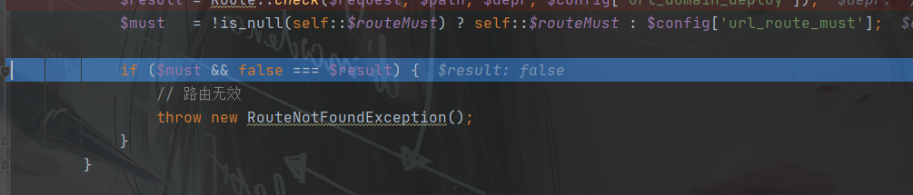 第一行进行了分隔符替换 从index/\think\app/invokefunction 变成了index|\think\app|invokefunction ,这里都没什么问题,来到强制路由检测  可以看到 如果$must 为真 也就是开启了强制路由的话,则会报错 我们的路由就无效。现在默认为false,我们可以继续跟进 获得了$dispath 的值