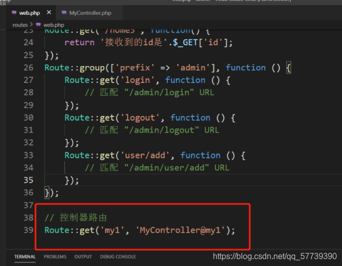 在Laravel中如果需要使用facades的话,但是又不想写那么长的引入操作: 则可以在config/app.php中定义长串的别名(在aliases数组中定义别名): ??????? 接下来输入如下代码: 在web.php 中定义控制器路由: 在laravel框架中也可以使用dd(需要打印的内容) (dd = dump + die)但是dd函数之后的内容将不会继续执行,dump后续代码还可执行。 我们在TestController 下输入如下代码进行测试: ??????? 效果如下: ??????? ???????