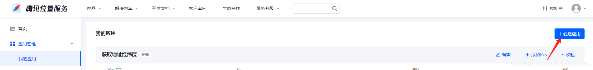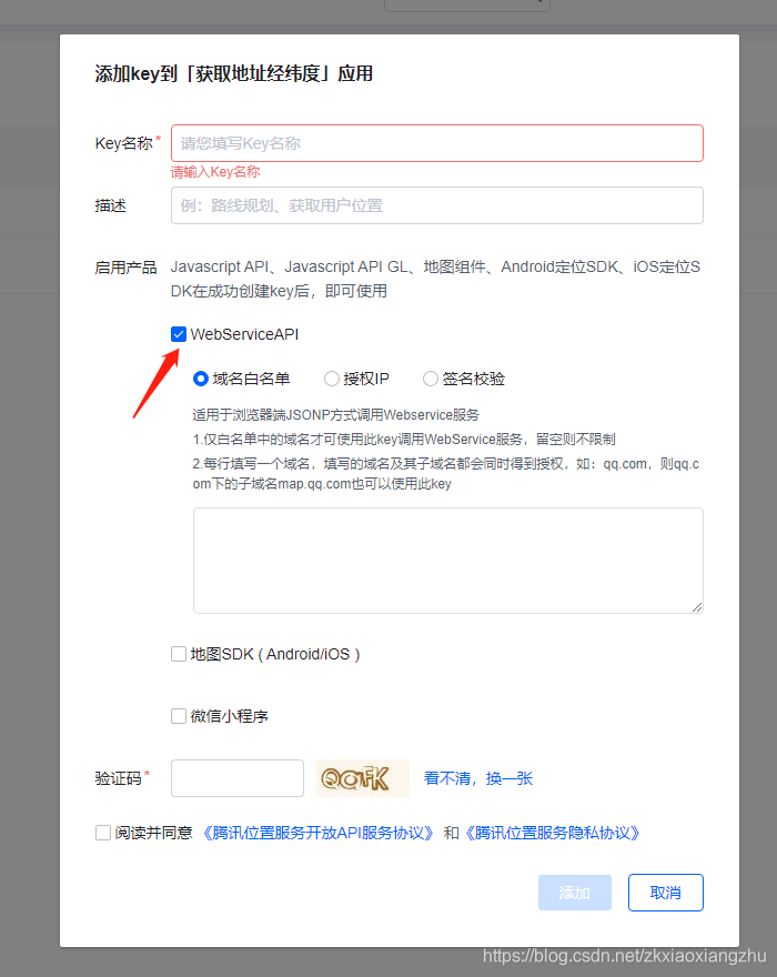 创建好应用之后添加key,选择WebServiceAPI