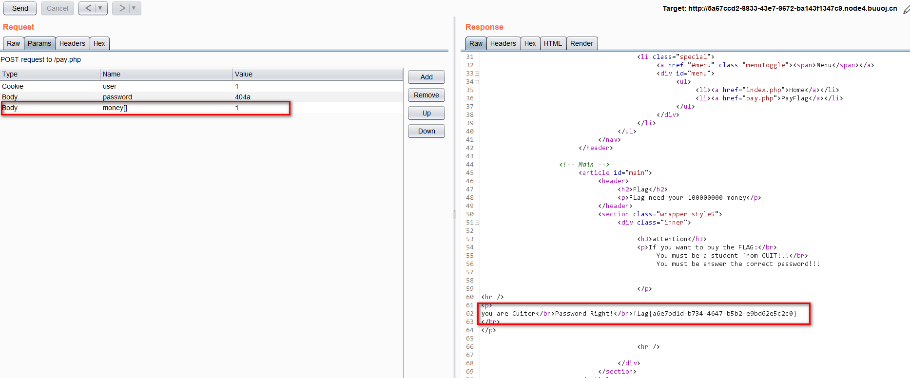 - 再传入money=100000000,提示过长,猜测strcmp进行比较,传入money[]=1