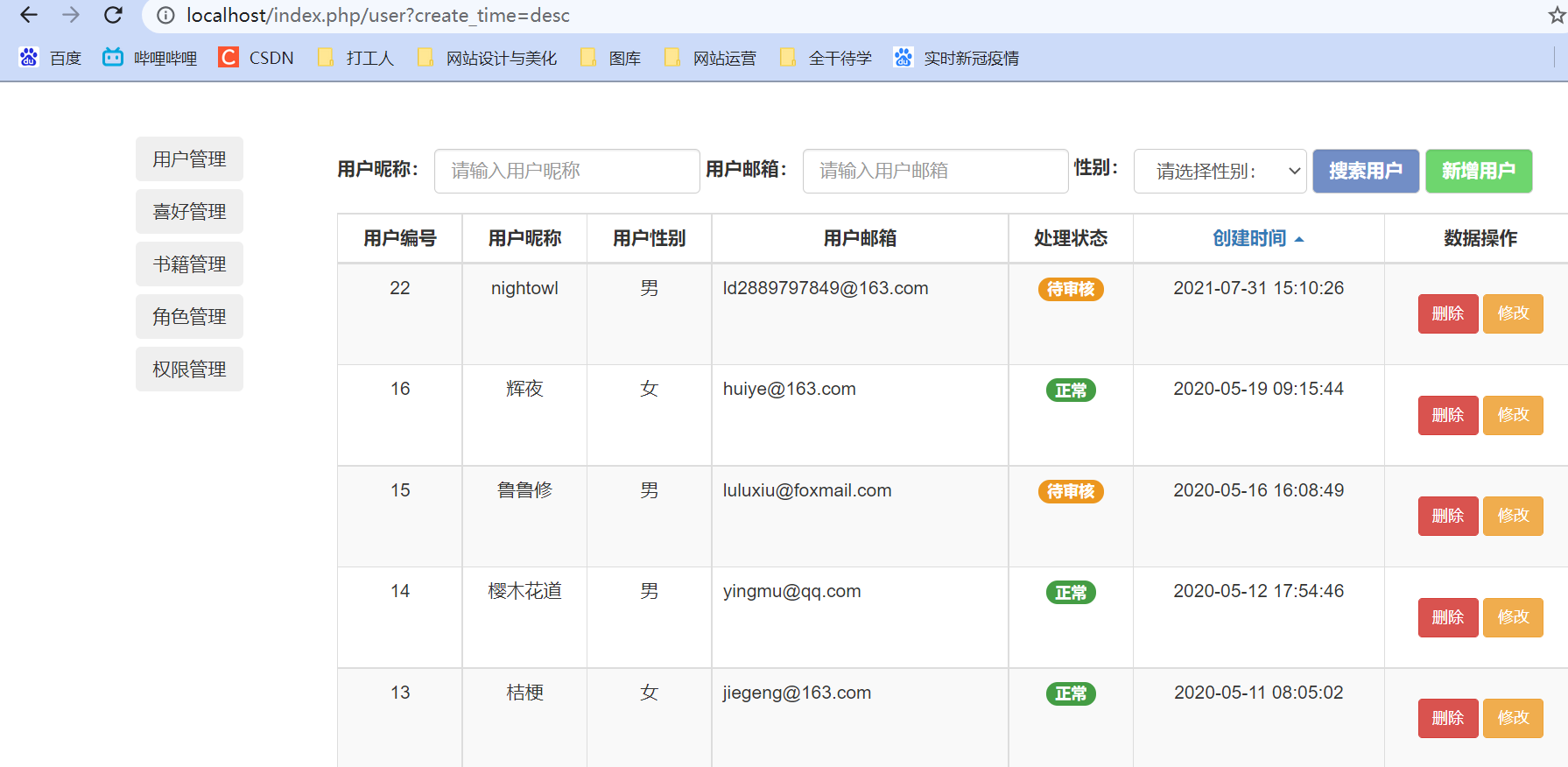 在导航栏写入localhost/index.php/user?create_time=desc回车得到如下效果:  解释:这种方式即为get传参,传递参数create_time=‘desc’给后端,后端通过request()->param()的助手函数得到参数值’desc’,并将该参数传递给后端model的SearchCreateTimeAttr()方法(通过第二个参数$value传递),这样才依次完成搜索和排序过程。 ????接下来,我们希望能够实现点击创建时间便能够直接进行排序,修改UI,进入app/View/User/index.html文件中,将"创建时间"一栏改成如下代码: