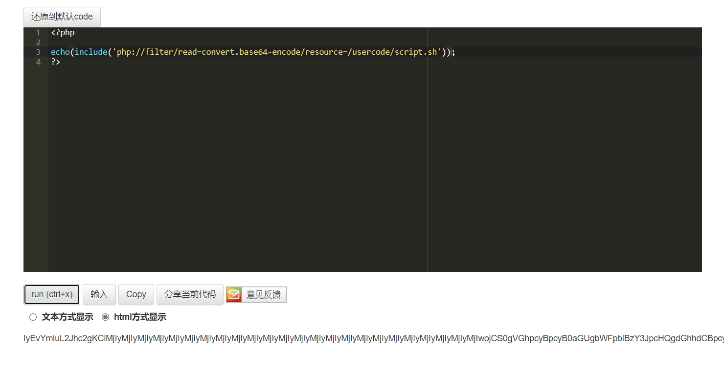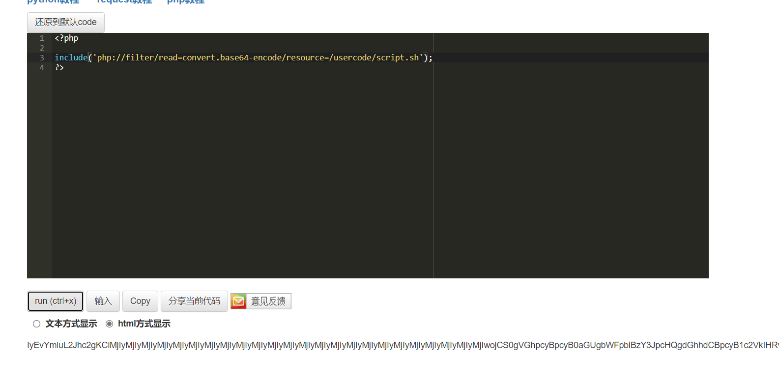 有同学可能疑惑为什么读源码还要麻烦的加个base64-encode?? 因为这边不想让服务端把这些源码解释掉,我们在访问不同网站时都不需要配置对应的解释器或运行环境,因为我们的客户端只是能理解html的浏览器罢了。 php是服务器端解释的语言,http提交请求给服务器,由服务器对php文件进行解释,最终生成相应的html,作为响应返回到浏览器,所以你看到的就是html。我们在读链中进行base64编码后,php解释器就认不出源码了,也不会去解析它。 实操一下  如果include一个纯文本,php解释器没有去解析他,就直接呈现在前端了。 所以这里过滤器的作用就是骗过服务端。