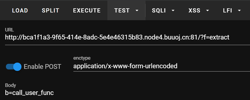 可以利用extract 函数将变量b覆盖为call_user_func ,这样,就成了: