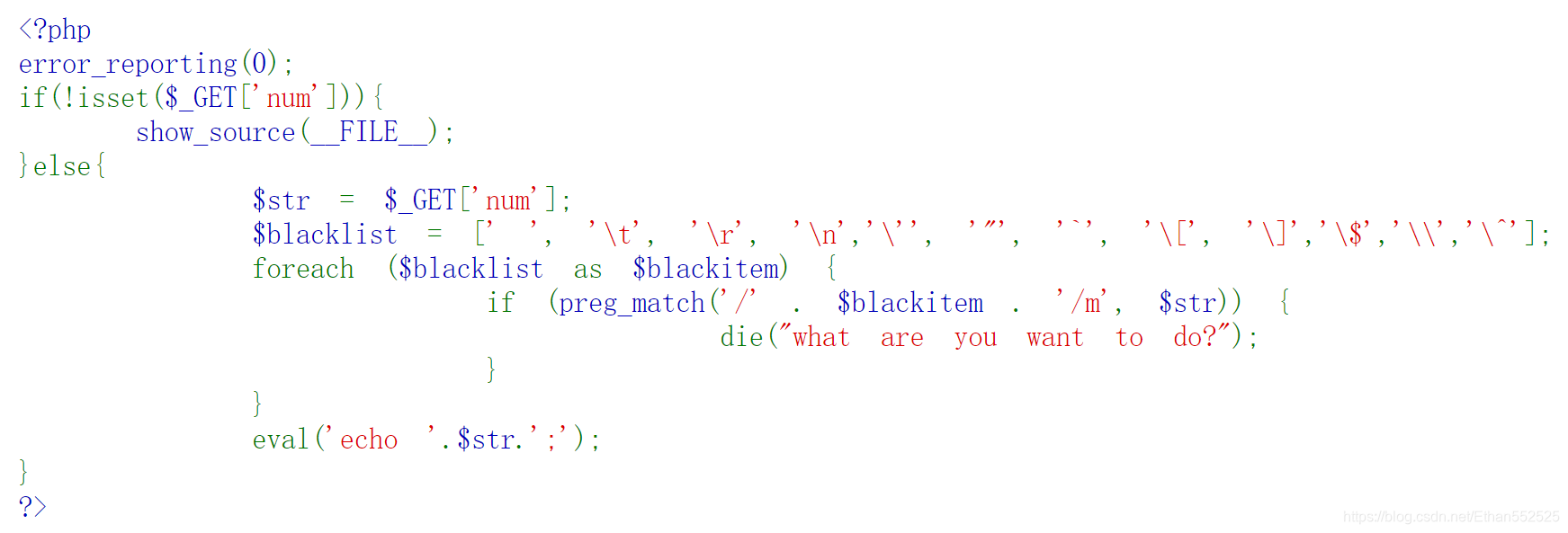 ????????过滤了一些特殊符号:空格、\t、\r等,正确传入num参数后,执行 eval('echo?'.$str.';'); 语句。