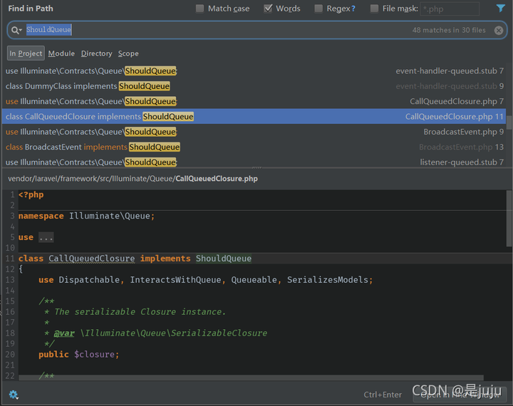 ?全局搜索调用ShouldQueue接口的类,随便确定一个(本菜鸡复现时选的是CallQueuedClosure)
