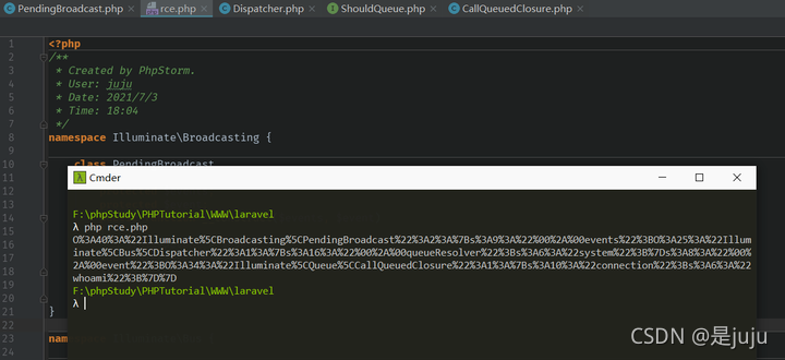 现在就是令$command=new CallQueuedClosure(),且new CallQueuedClosure()中存在$connection为我们要执行的命令;