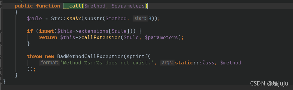 因为调用dispatch(),所以这里$method就是dispatch,所以$rule = Str::snake(substr($method, 8))返回为空''