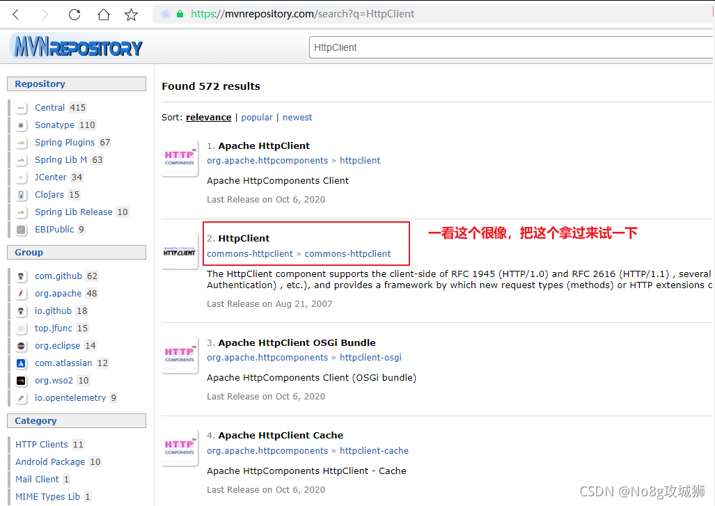 哇塞,好家伙,有572条结果,到底哪个才是呢,找与报错信息最相关的 org/apache/commons/httpclient/HttpClient ,而根据搜索结果 只有第二个 commons-httpclient ? commons-httpclient 的 HttpClient 最符合,所以就先拿这个来试一下吧。