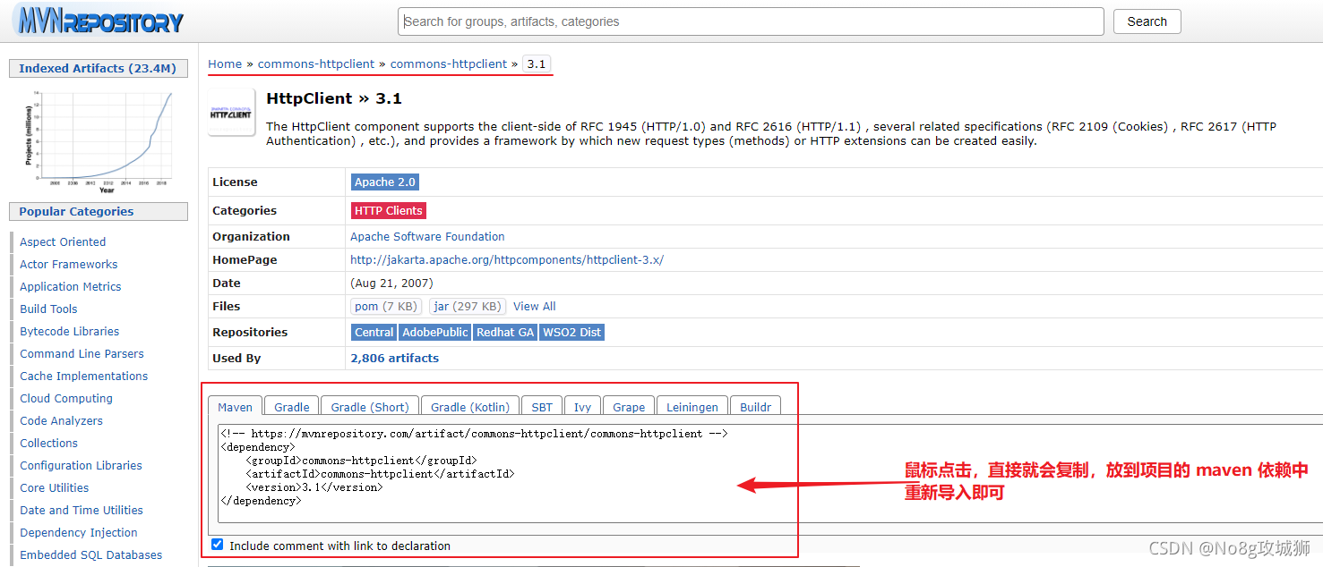 点击进去,找到使用最多的一个版本,Version 3.1,再点击进去,把 maven 依赖拷贝出来放到项目中,重新导入一个 maven 依赖,再次测试,一切正常。