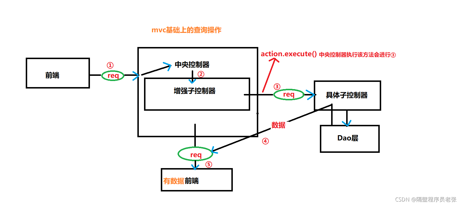 射实例,使用增强子控制器说明实例化。调用execute()方法,子控制器调用Dao层进行数据