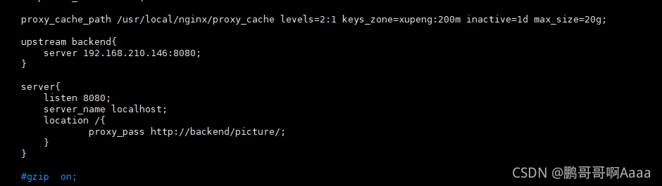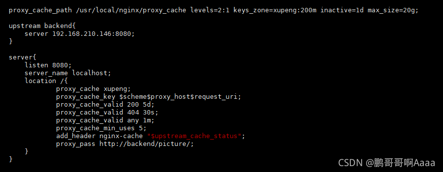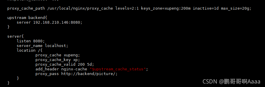 #keys_zone=xupeng:200m 缓存区的名称是xupeng,大小为200M,1M 大概能存储8000个keys