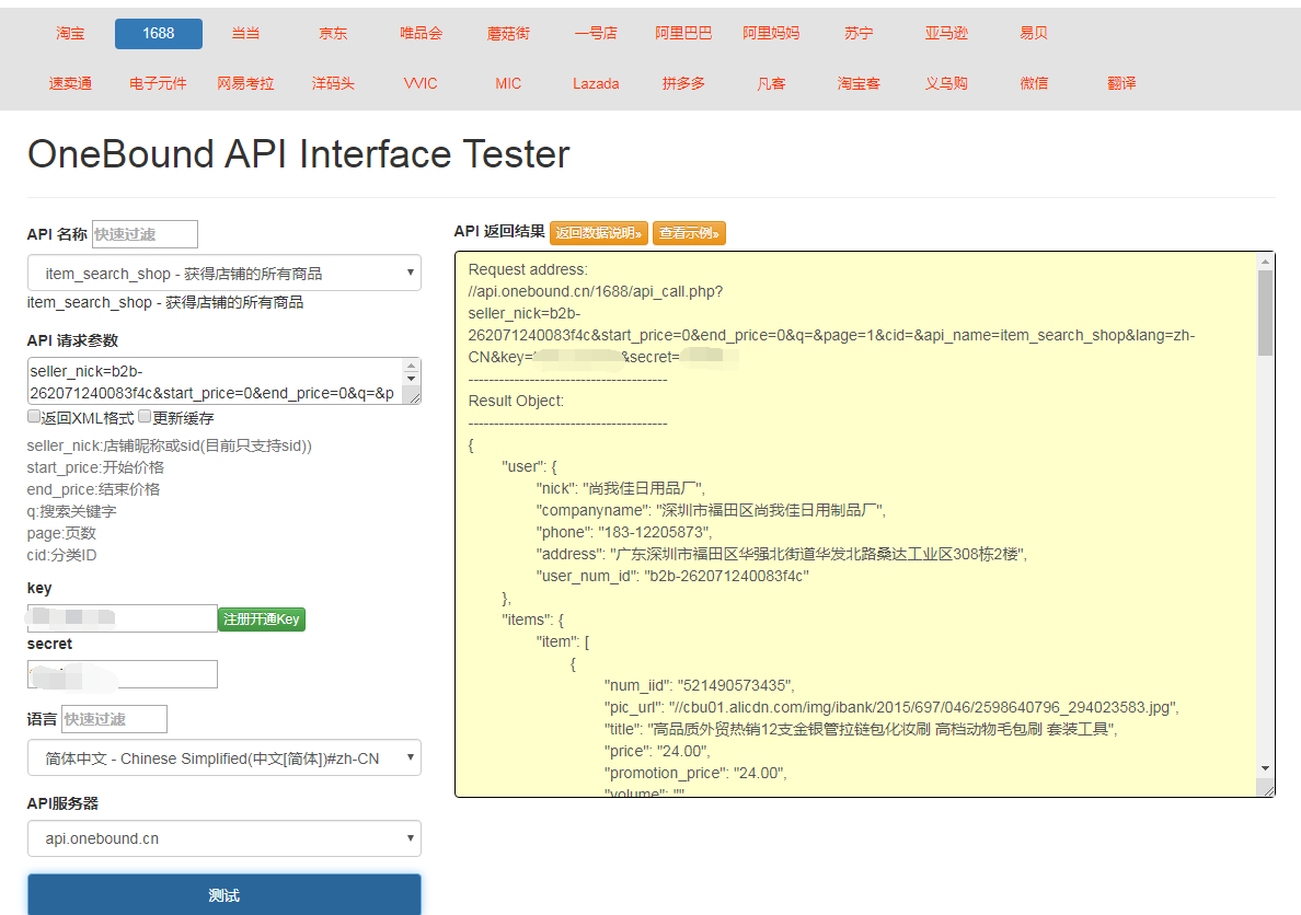 ? 获取店铺的所有商品返回数据 测试演示参考:http://console.open.onebound.cn/console/index.php?i=Simon  ?