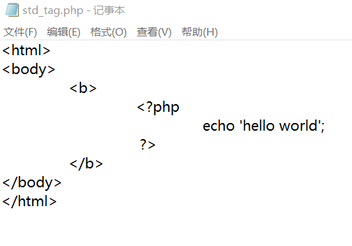 脚本标记:   上图用第三种标记方式,把php嵌入到了htm中,实现了在页面中加粗输出hello world -