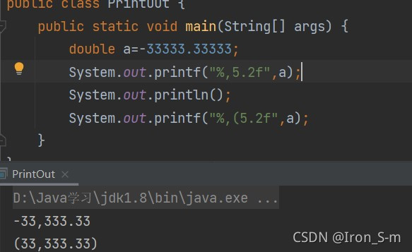 + | 打印整数和负数的符号 | +33.333 | 空格 | 在正数之前加上空格 | | 333.33| | 0 | 在数字之前补零 | 000333.33 | - | 左对齐 | |333.33 | | ( | 将负数括在括号里 | (333.33) | , | 添加分组分隔符 | 333,333.33 | #(对于f格式) | 包含小数点 | 3,333.33 | #(对于x或者o格式) | 添加前缀0x或0 | 0xcafe | $ | 指定要格式化的参数索引。例如%1d %1x将以十进制的格式打印第一个参数 | 159 9F | < | 格式化前面的说明的数值,例如,%d%<x将以十进制和十六进制打印同一个数值 | 15 9F |
