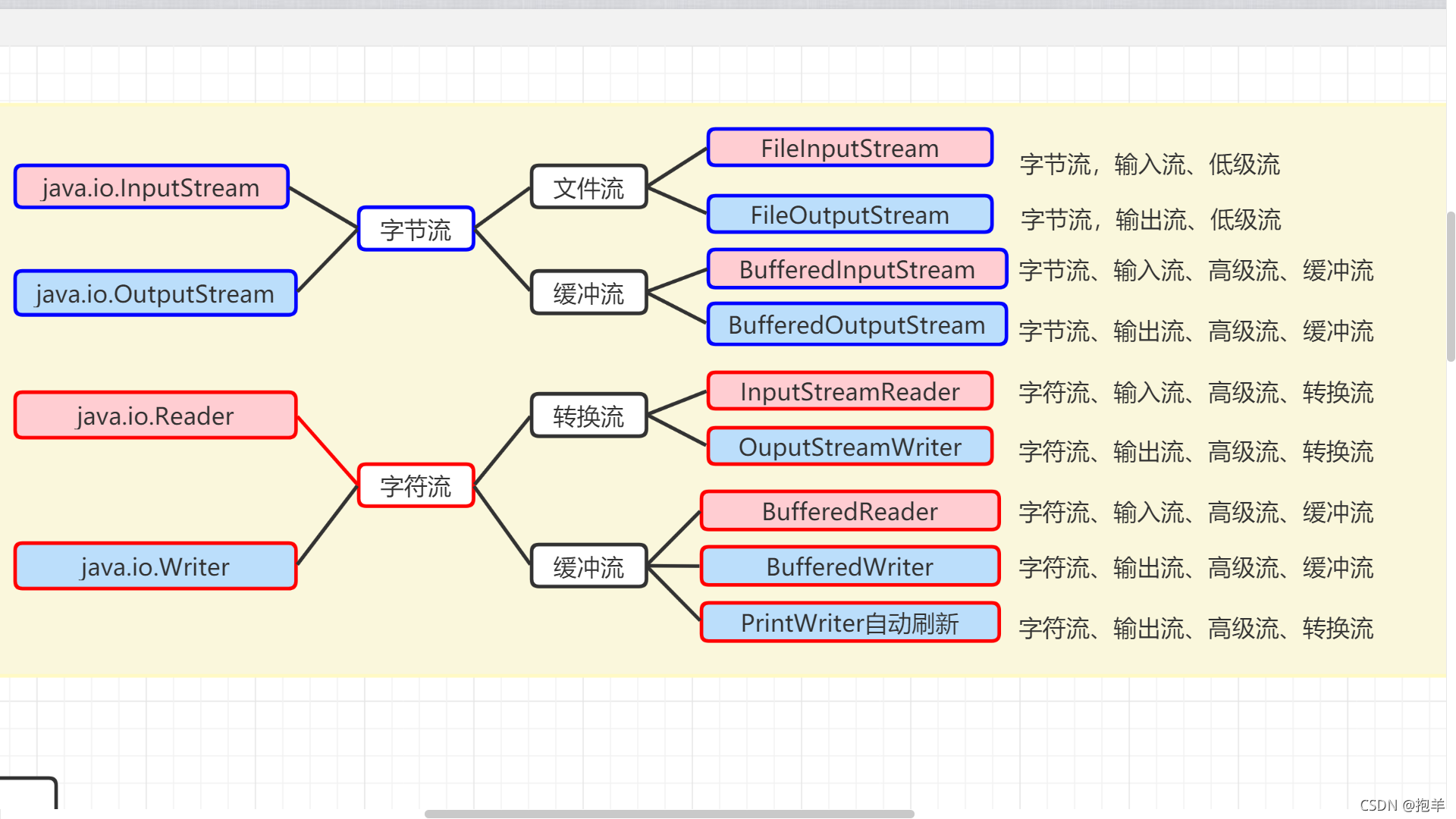 是所有字符流的超类,与字节流的超类平级,也是抽象类,里面规定了所有字符流必须具备的读写字符的方法。字符流最小的读写单位是char字符,但是底层实际读写的还是字节,只是字符与字节之间的转换工作由字符流来完成。
