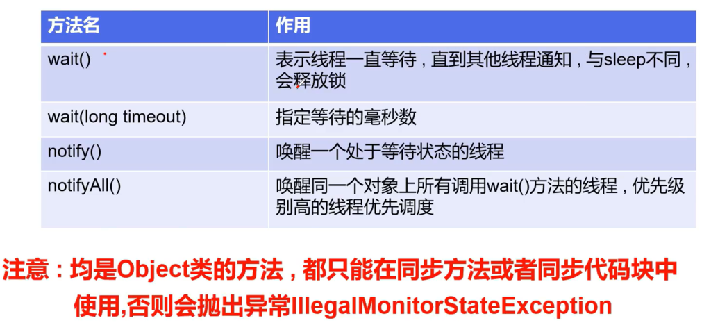 四、线程常用方法1、获取当前线程对象----Thread.currentThread()? ? main方法中---当前线程就是main方法 ? ? 线程类中---谁在执行run方法,当前对象就是谁 2、获取和设置线程名称---线程对象.setName()3、线程休眠----Thread.sleep(毫秒)? ? 作用:让当前线程进入阻塞状态,放弃占有的cpu时间片 (1)线程的调用:类名.sleep() (2)静态方法与对象无关,只能用类名进行调用,且在哪调用,哪个线程休眠 ? ? ? ? 如,在main方法中调用终止主线程,在自定义线程中调用终止自定义线程? ? 4、唤醒睡眠---线程对象.interrupt()5、终止线程---stop()一个线程本来运行结束需要10s,需要在5秒后终止该线程,即只让线程执行5秒 (1)强行终止线程的执行---stop() ? ? 缺点:容易丢失数据, ? ? ? ?这种方式是直接杀死线程,线程没有保存的数据容易丢失 (2)合理终止线程的执行---打标记run=true,当run=flase--->return; ? ? ? ?在return前有想要保存的数据可以加save语句进行保存。 6、守护线程----线程对象.setDaemon(ture)? ? ?作用:调用守护线程的用户线程结束,守护线程随之结束,即使守护线程是死循环需一直运行 ? ? ? ? ? ? ? ?即,守护线程的生死不由其本身的运行状态决定,由其用户线程决定 ? ? ? ? ? ? ? ?如,t是守护线程,main方法中调用并启动该线程,此时main方法是其用户线程 ? ? ? ? ? ? ? ? ? ? ? 当main方法执行结束后,t线程也随之结束,不管run方法是否执行完毕 7、设置线程调度优先级---Thread.currentThread().setPriiority(1)? ? ?优先级设为1 8、线程让位----Thread.yied()? ??? 在哪个线程中调用该函数,哪个线程等待,不执行(静态类,类名.调用) 9、线程合并----t.jion()? ? ?谁调用jion函数,谁先执行,其他线程等待(线程对象.调用) 10、线程等待----对象.wait()? ?作用:? ?让当前线程等待并释放占有的共享对象锁 11、唤醒线程-----对象.notify()? ?作用:-唤醒线程,但不释放共享对象之前占有的锁 ? ?notifyAll()---唤醒该对象上等待的所有线程 【注】sleep()和wait()区别? ? ?1、sleep来自Thread类----线程对象的方法【Thread.sleep()】----让线程休眠进入阻塞状态, ? ? ? ? ? ? ? ? ? ? ? ? ? ? ? ? ? ? ? ? ?放弃占有的cpu时间片,但不释放锁 ? ? ? ? ? wait来自object类----Java对象的方法【对象.wait()】-----让本线程等待唤醒再执行, ? ? ? ? ? ? ? ? ? ? ? ? ? ? ? ? ? ? ? 释放占有的锁 ? ? 2、sleep任何地方都可以,在哪个地方调用,对应哪个线程类休眠 ? ? ? ? ?wait只能在同步代码块中使用,共享变量调用并等待 ? ? 3、sleep需要捕获 ? ? ? ? ?wait不需要 12、计时器 ---Timer(1)创建定时器对象 ? ? ? ?Timer timer =new Timer(); (2)指定定时任务 ? ? ?? ?timer.schedule(要执行的任务类对象,开始执行任务时间,间隔多久执行一次) (3)编写需要执行的任务类---extend TimerTask