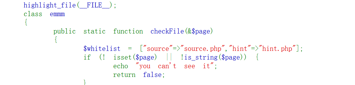 //highlight_file(filename,return):对文件进行高亮显示,使用该函数时对整个文件被显示,不论是密码还是其他敏感文件