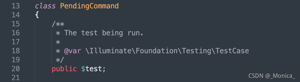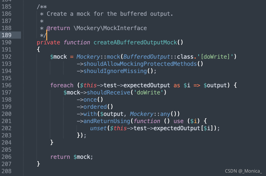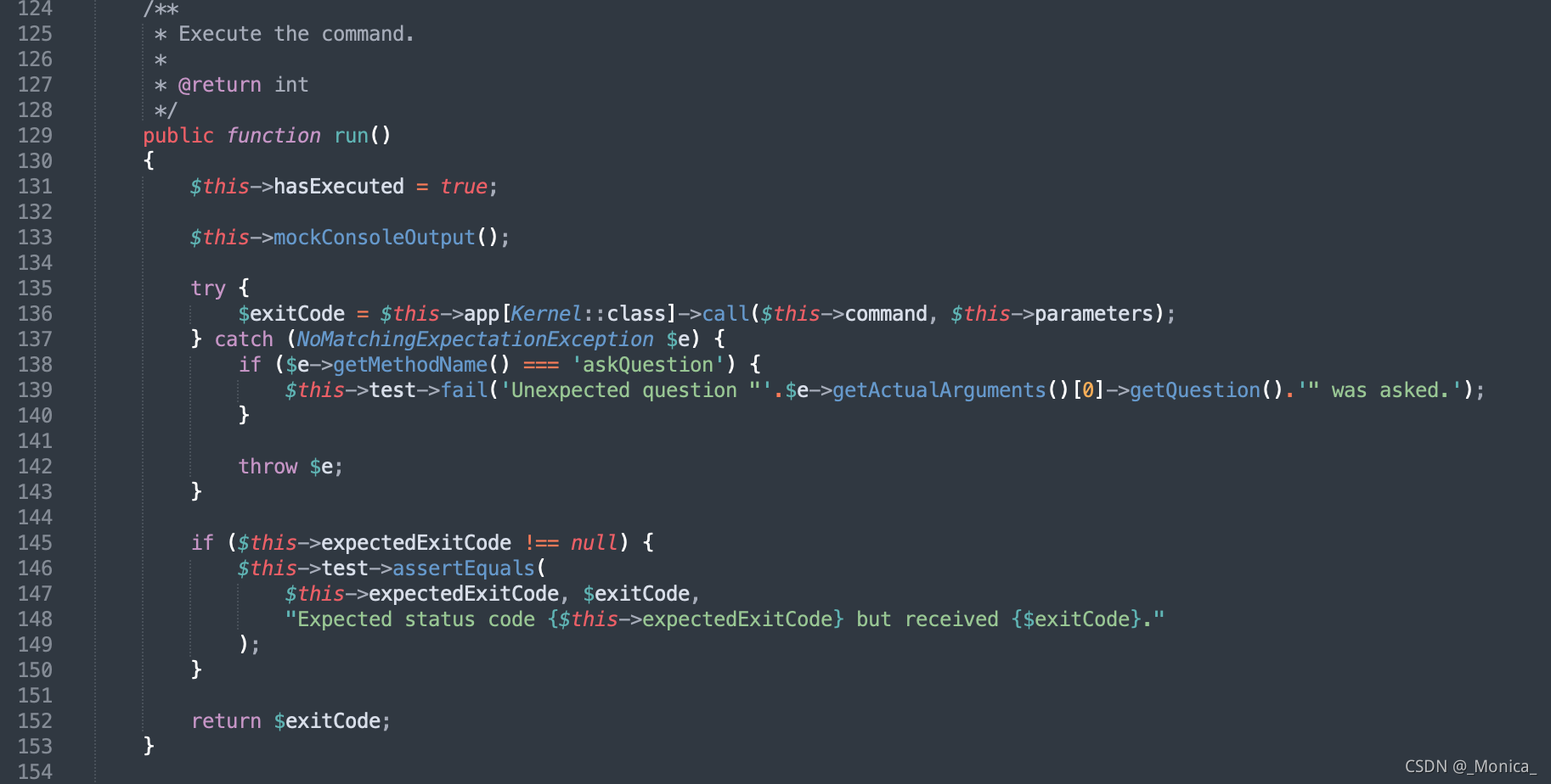 ?又使用Mockery::mock实现对象模拟?,其他的不重要,看foreach里面,要求获取$this->test这个类中的expectedOutput属性,并且遍历该属性。报错的原因就是因为$this->test没有expectedOutput这个属性,跟进一下这个属性,发现这个属性在trait InteractsWithConsole中,而trait类我们没法实例化,在其他我们可以实例化的类中,也没有一个类存在expectedOutput属性,此外就只有一些测试类有这个属性,因此这里就卡住了。