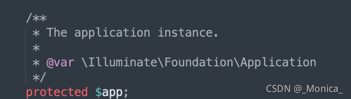 $this->app; //一个实例化的类 Illuminate\Foundation\Application