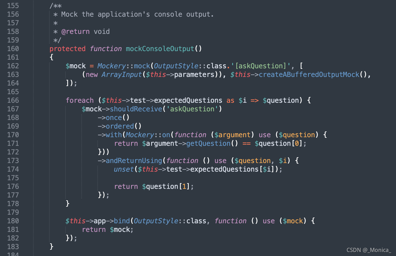 这样我们就能顺利地把$this->mockConsoleOutput()走通了。
