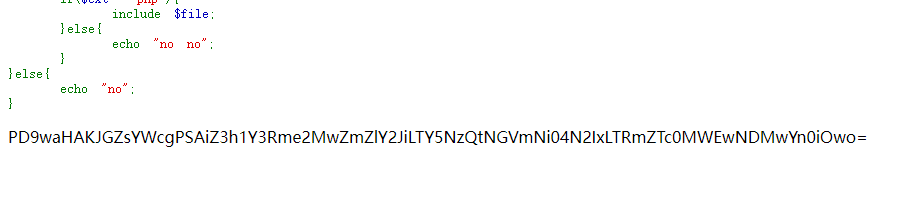 然而什么都没发生,这时候我想起之前看到的文章,可以用php://filter/read=convert.base64-encode/resource=xxx.php 把指定php文件的源码以base64编码形式打印出来,然后试了下:
