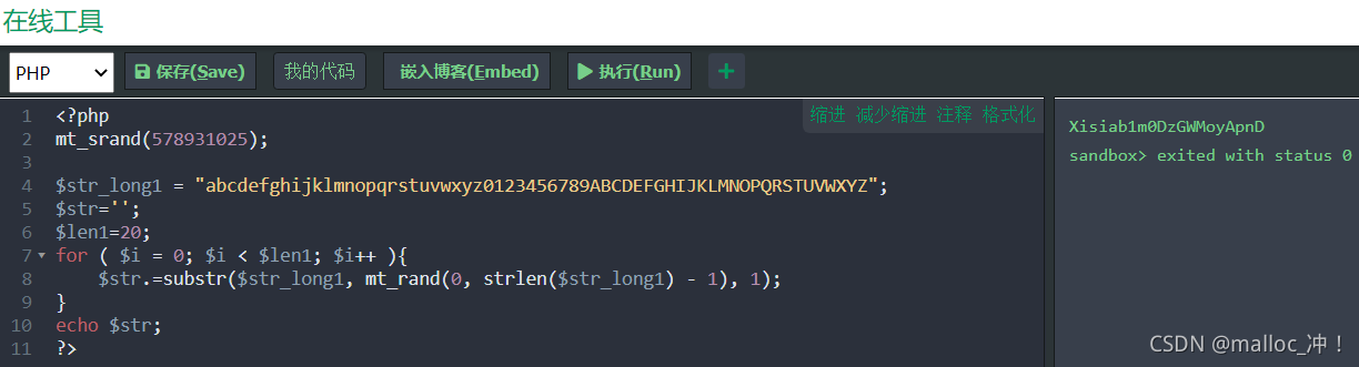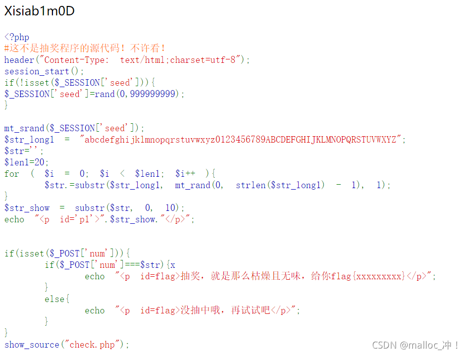 原理:因为代码中是通过种子seed生成了随机数,但是mt_srand()这个函数存在漏洞,php中mt_rand()生成的是一个伪随机数,是通过算法生成出来的,可以根据这个来进行爆破得到mt_srand()里的种子