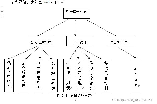 系统实现 后台主要功能是为前台提供信息,前台主要是公交信息查询,后台主要功能就是对公交信息的维护,主要包括:路线维护,用户管理功能:用户的密码修改,用户添加和删除功能。 2.3.1线路维护 ?线路维护主要维护以下信息:车次维护、站点维护、车次/站点维护 内容摘要?I 第1章 前言?1 1.1? 公交路线查询系统?1 1.2? 选题目的?1 1.3? 技术的选定?1 1.3.1 php?1 1.3.2? 数据库—mysql?2 1.3.3? 编程语言?3 第2章 系统分析与设计?5 2.1? 公交管理系统的需求分析?5 2.2公交查询系统的体系结构设计?6 2.3系统实现?7 2.3.1线路维护?7 2.3.2服务维护?9 2.4? 数据库设计?9 第3章 系统功能模块的创建与实现?13 3.1? 公交路线查询系统功能模块界面实现简介?13 3.1.1? 车次查询?13 3.1.2? 站名查询?13 3.1.3? 起始站点至目的站点查询?14 3.2? 管理员模块?15 3.2.1? 添加线路?16 3.2.2? 修改线路?16 3.2.3? 删除线路?17 图3-7? 管理员删除线路功能?17 3.2.4? 留言管理?17 第4章 系统测试?18 4.1? 白盒测试?18 4.1.1? 正确性测试?18 4.1.2? 测试环境配置?18 4.2? 黑盒测试?18 4.2.1? 功能性测试?19 4.2.2? 容错性测试?19 4.2.3? 系统功能用例测试?20 第5章 结 论?23 5.1? 心得体会?23 5.2? 不足与展望?23 ?