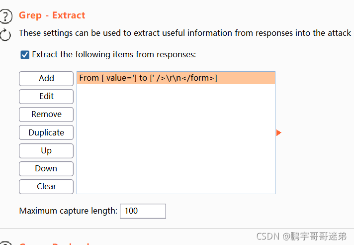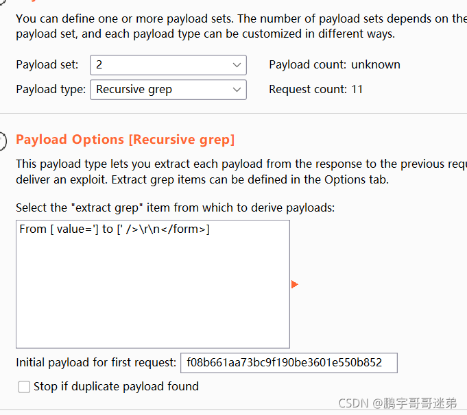 ?设置密码本,点击payload,选择第一项的密码本与低等级的相同,第二项的时候选择Recursive grep 并且把之前得到的token值粘贴到下方的方框中。