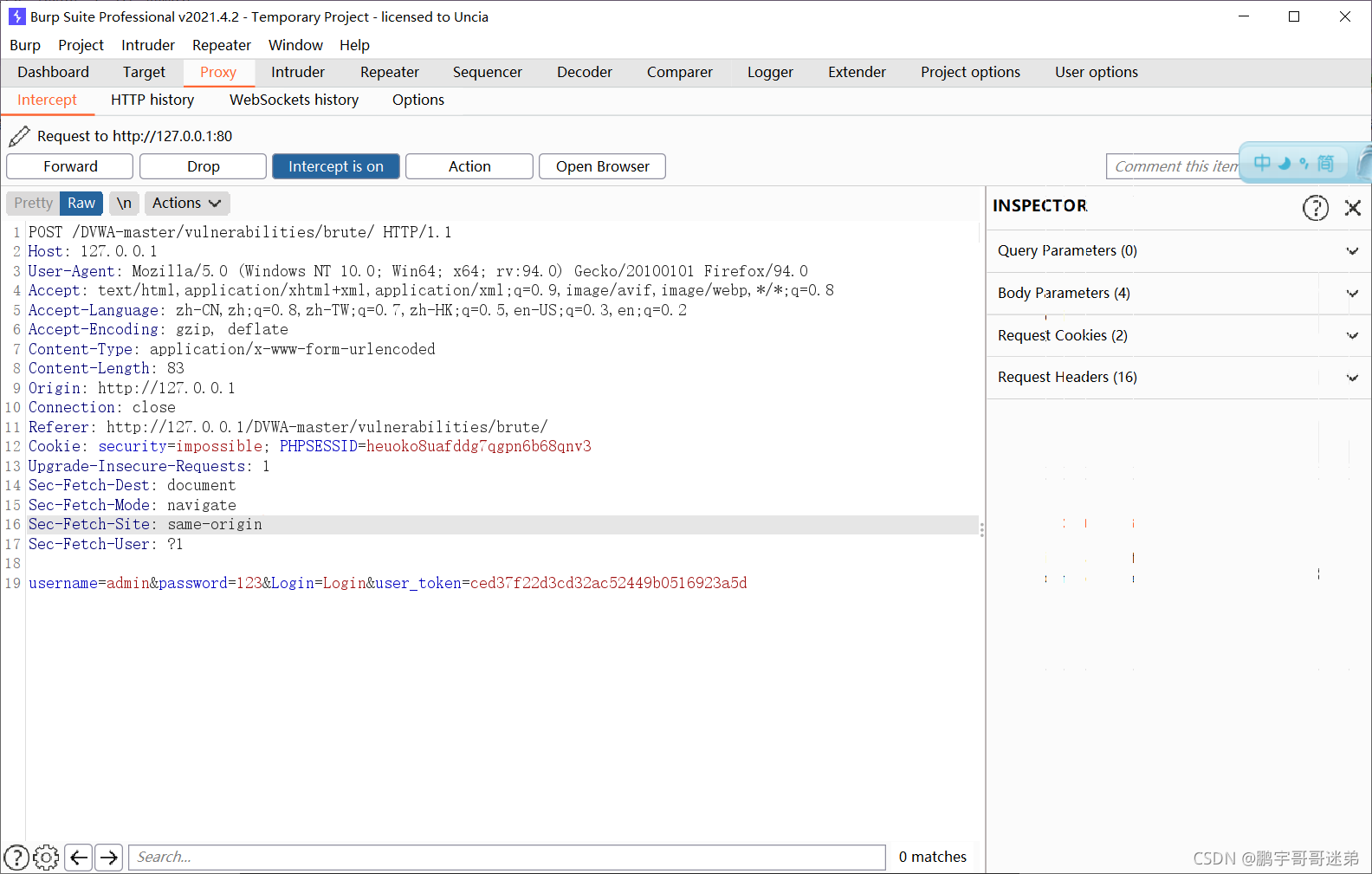 使用burp抓取user-token参数,使用Pitchfork模式验证跑包。设置跑参点,加载字典使用穷举法猜解出用户口令(也可以使用python脚本进行跑包)