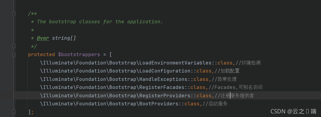 ????????register 和?boot 方法:不要在 register 方法里面使用任何服务。该方法只是用来将对象绑定到服务容器的地方。所有关于绑定类的解析、交互都要在 boot 方法(服务提供者的另一个方法)里进行。