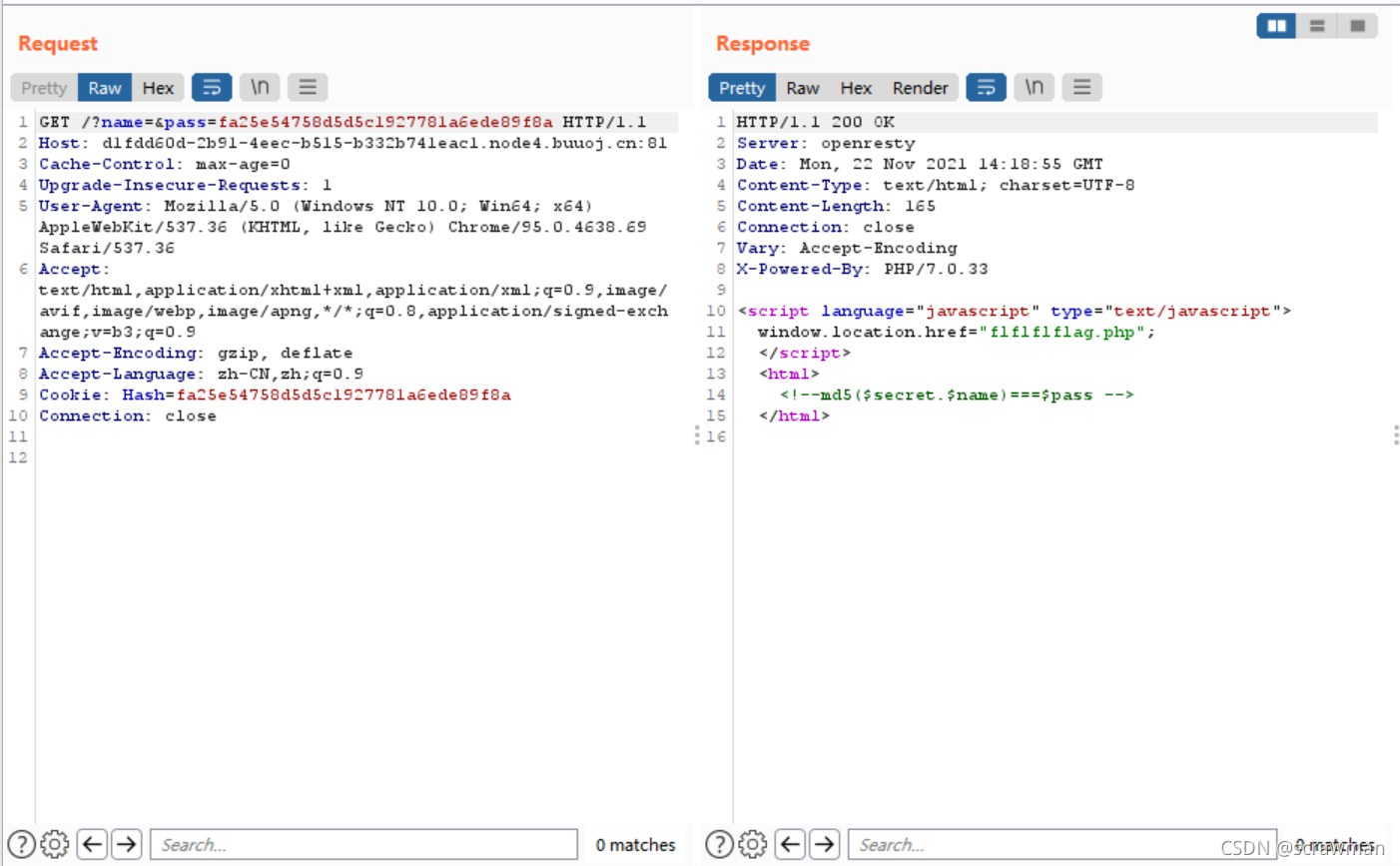[NPUCTF2020]ezinclude 如果什么都没传会返回这个Hash值,猜测是name为空时pass的值  整挺好,跳出来了flflflflag.php 因为直接访问会跳到404页面所以还是得抓包