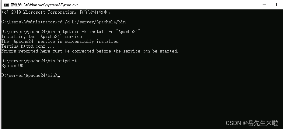 httpd.exe -k install -n "Apache24" 回车(Apache24是给服务起的名字)