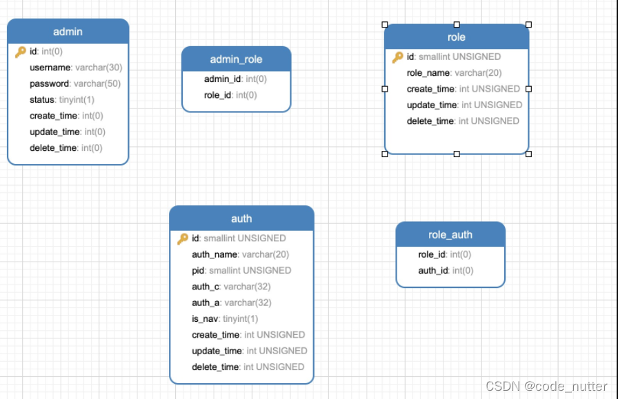 大致会用到五张表:用户表、角色表、功能表,还有他们之间互相关联的表:用户与角色表、角色与功能表