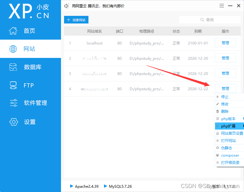 然后点击网站->管理-> php 扩展->redis? 点击开启即可
