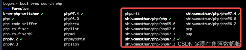 如果 tap 超时, 则用浏览器打开?https://github.com/shivammathur/homebrew-php?, 下载压缩包 或者直接百度云下载 百度云:https://pan.baidu.com/s/1lsp-E9gMI1Y-hJcT5eBkIA? ? 提取码: uww8 解压至 /usr/local/Homebrew/Library/Taps/shivammathur/homebrew-php (不存在则需要手动创建目) 解压命令:unzip 文件名,解压后文件夹名称必须为homebrew-php 3、重新 brew search php
