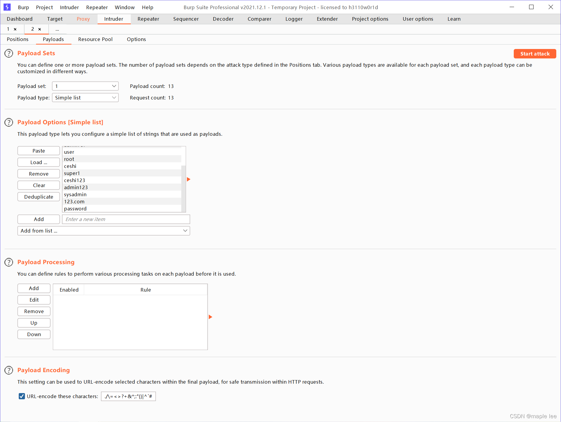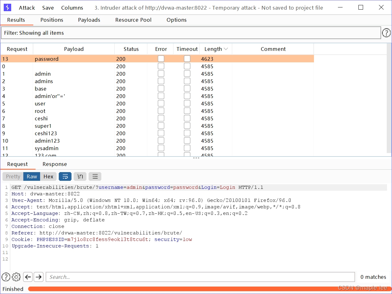 已知用户名,尝试使用burp爆破密码
