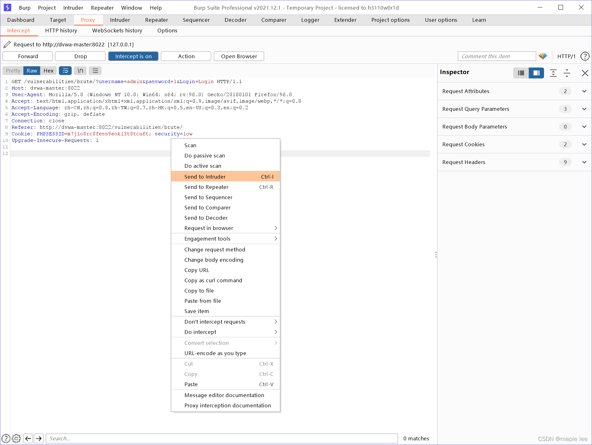 随意输入一个密码,将其发送至burpsuit intruder