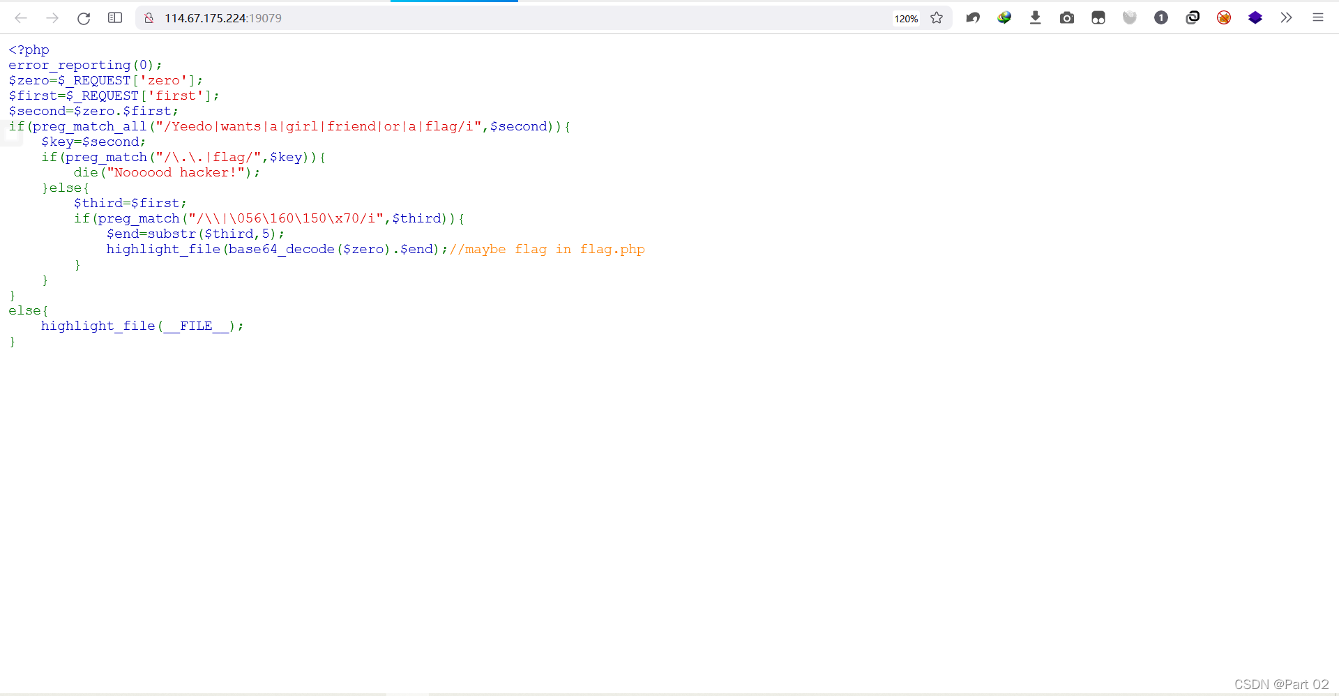 highlight_file(base64_decode($zero).$end);//maybe flag in flag.php