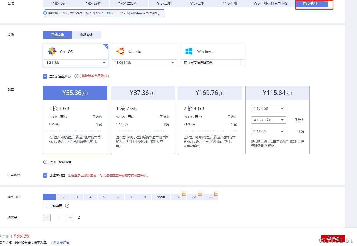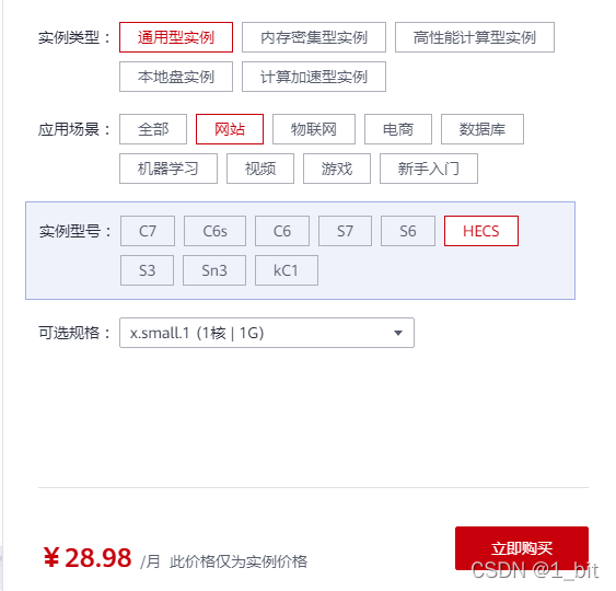 怎么说呢这个,有以下几个点: 1.毕竟这一篇是初级文,作为新手选择我比较懒,在华为云中直接可以介绍当前服务器的性能偏向,挺好的,对于新手来说直接看自己的选择就可以了,你不信你看下面这个(因为买这个服务器几个月之后发现我亏钱了,不信你们接着往下看):  第二点还有啥?当然是价格了,对于其他服务器来说华为云是比较优惠的,我就买了一个通用的HECS才60块钱一个月,拿起来做测试非常方便:  我不是说是60的吗,怎么是28块钱了? 这是单个服务器的价钱,进去后还会有其他付费的:  好了,你们以为这价钱够便宜了?!不不,事情还没完,因为我这篇文章写了一直没发,结果现在进去发现 35 可以买一年!原来我之前买亏了呀…  这是活动界面:  给你们链接:点这里进活动页