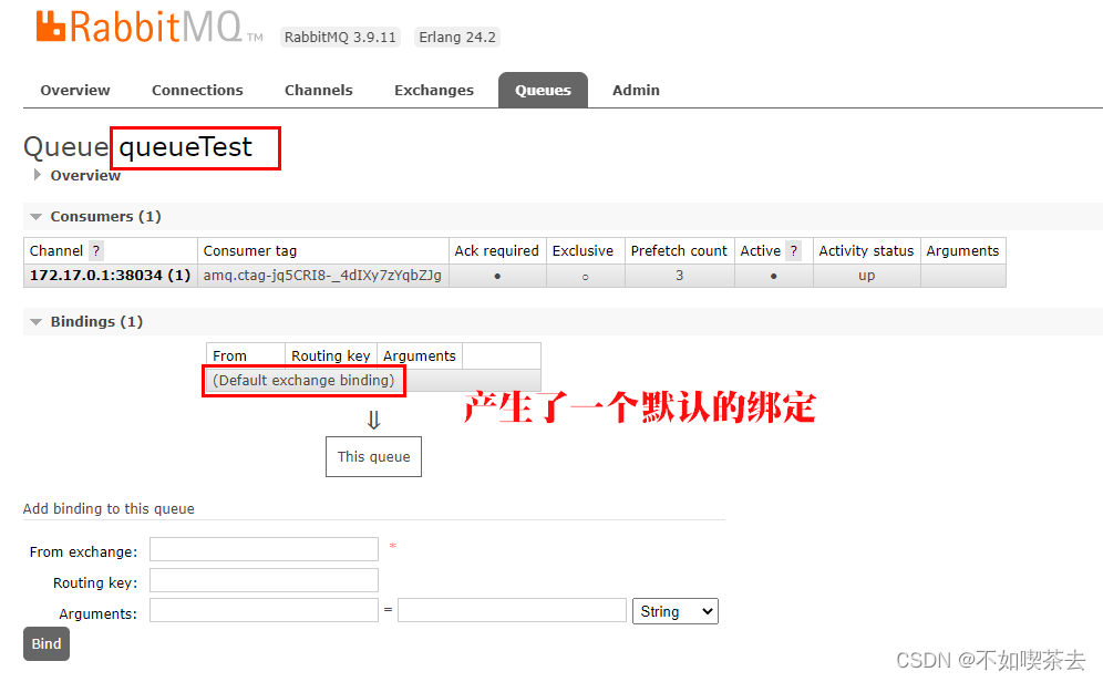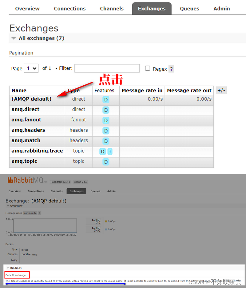 ?现在,再回头看上面的第6点,两者都不指定交换机,消费者指定的队列名和生产者指定的路由键名称相同都是“queueTest”,交换机会默认为“AMQP default” ,生产者的消息会发送到队列名称 为queueTest的队列 中去。可以点击(AMQP default)交换机,可以看到bindings下面有句话,其实就是第6点的描述。