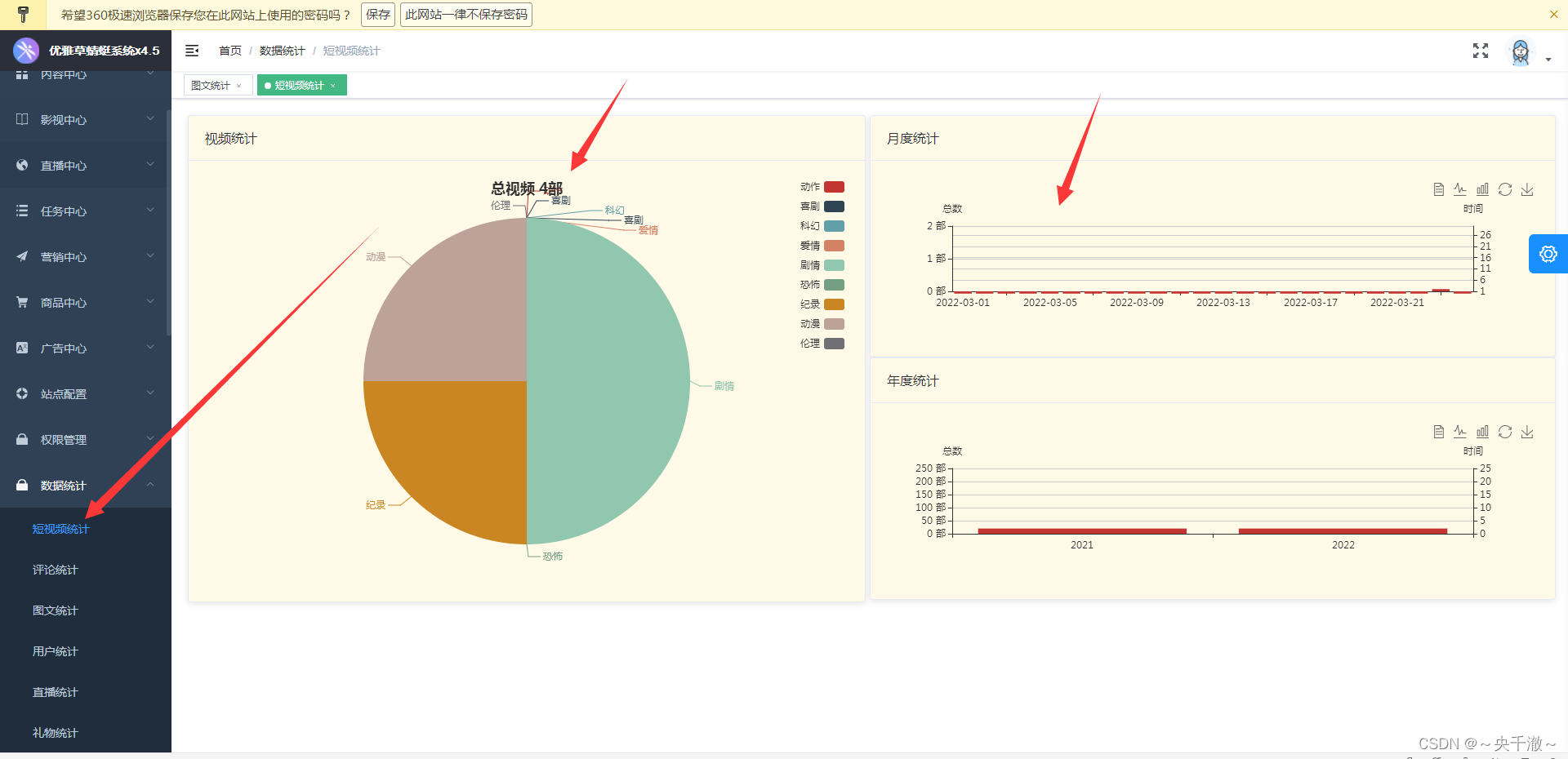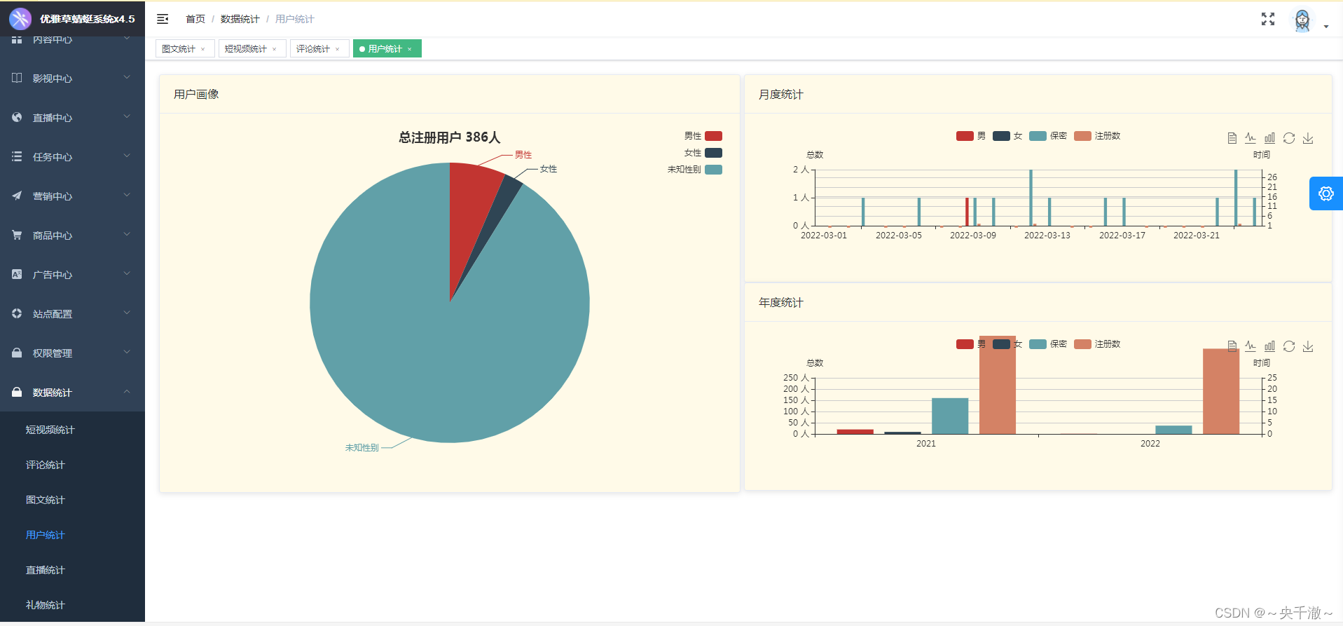 ·增加用户统计,用户画像,区分男性女性,月度统计,年度统计,注册用户数统计。 ·增加评论统计,最火视频以及图文评论数统计, ·增加视频统计,视频类型统计,月度统计,年度统计 ·增加直播统计,直播历史统计,直播热度统计 ·增加礼物统计,礼物点赞统计,最后礼物单品统计