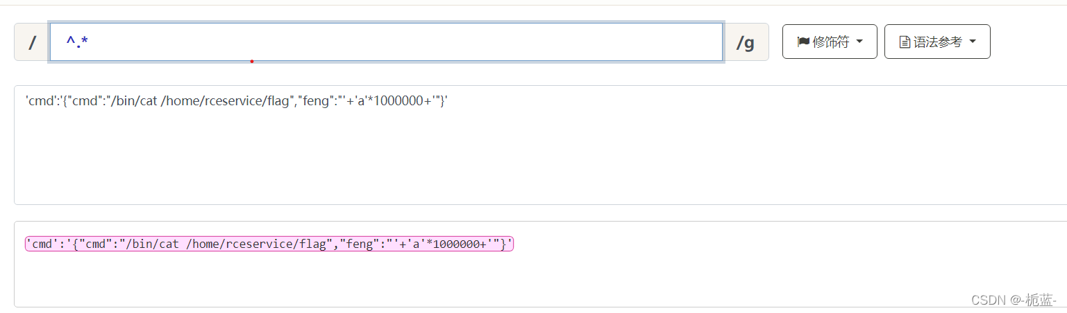 正则表达式最前面的匹配字符,^代表首个字母,'.'代表除换行符之外的所有字符,*代表前面那个表达式重复执行多次,因此他这里直接把我们的payload全部匹配完毕,导致后面的匹配不到字符了,只能一个个回溯