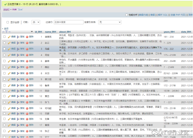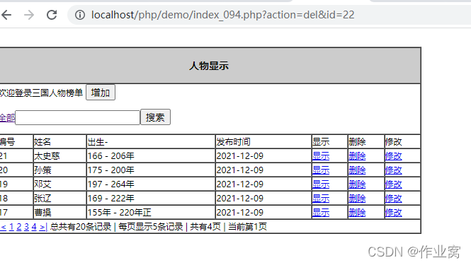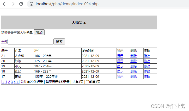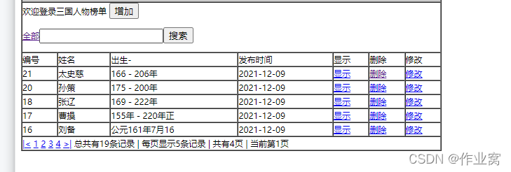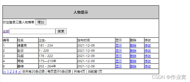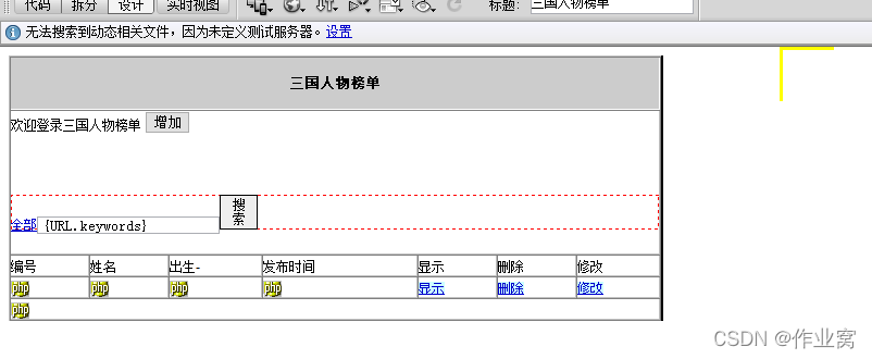 ? 使用DW创建一个三行一列的表格 在第一栏目设置网页标题为三国人物榜单 在第二栏目设置一个添加按钮,实现添加页面的跳转 再创建一个搜索表单. 设置输入框架的name为keywords 表单method为get  ? 查询数据 循环显示在页面,在每条数据库后添加显示,删除,修改按钮,并绑定ID  ?
