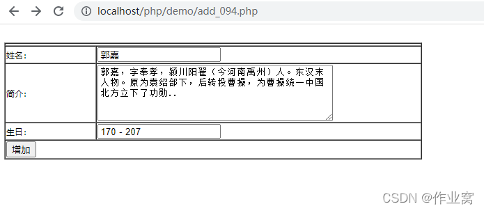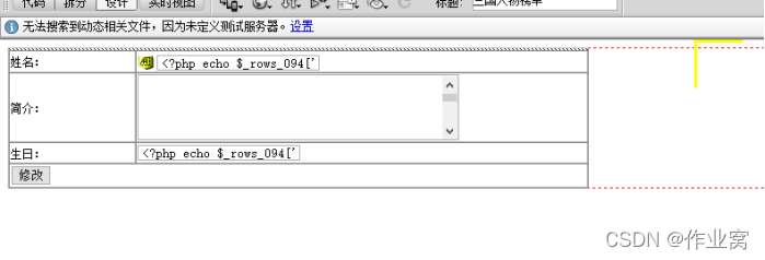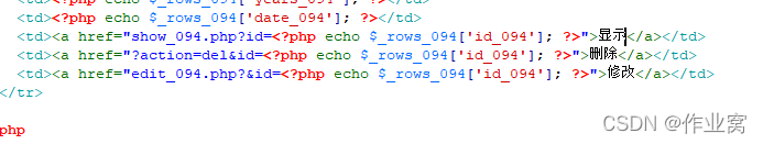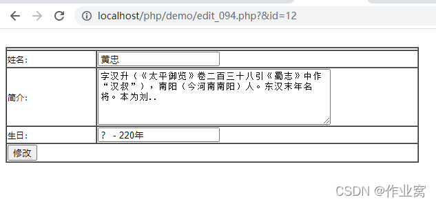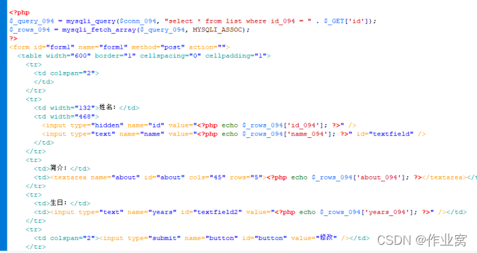 操作前:  ? 操作后:  ? 在表格循环显示的数据后添加编辑超连接,并绑定ID <td><a href="edit_094.php?&id=<?php echo $_rows_094['id_094']; ?>">修改</a></td> 创建修改表单;  ? 把查询出来数据显示到表单中。  ? 通过$_POST判断用户是否执行了修改操作 <?php include 'conn_094.php'; if ($_POST) { //判断post提供 ??$query_094 = mysqli_query($conn_094, "update list set name_094 = '{$_POST['name']}',about_094 = '{$_POST['about']}',years_094 = '{$_POST['years']}' where id_094 =" . $_POST['id']); ??echo "<script type='text/javascript'>alert('修改成功!!');window.location.href='index_094.php';ck();</script>"; //修改成功,返回主页 }; ?> 通过mysql_query 执行update语句中的id条件来执行并修改数据库