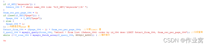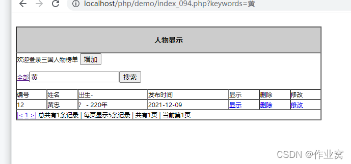 查询前:  ? 查询后:  ? 步骤: 在表格中创建一个表单; ? ? 通过$_GET[‘keywords’]判断是否执行了搜索操作。  如果执行了搜索操作则组装sql语句进行like模糊搜索. 搜索出来的数据赋值给$_rows_094通过while循环显示至表格中. 在每条数据后添加相应的操作按钮连接。